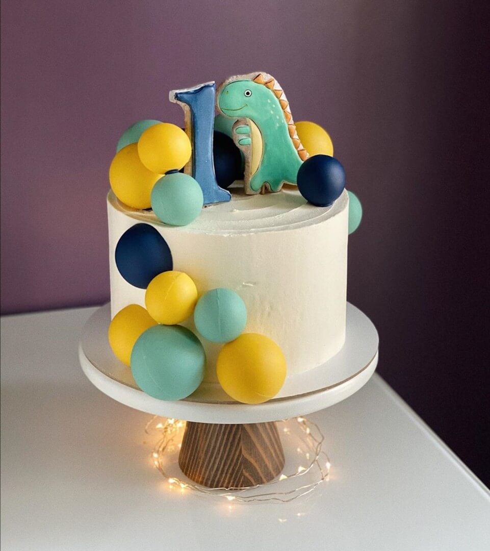 Яркий динозаврик как-будто нарисованный ребенком - что может быть лучшим украшением поздравительного торта для маленького именинника?