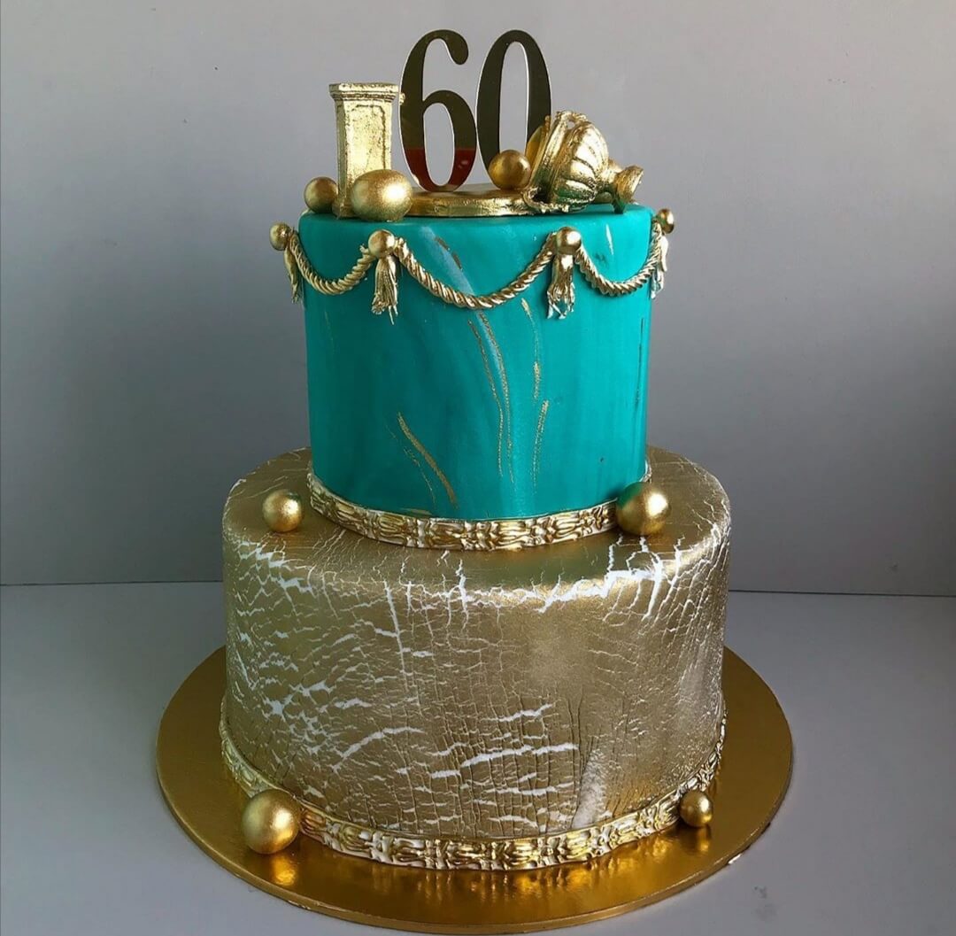 Роскошный торт, оформленный в золотых и бирюзовых оттенках, станет одним из главных фишек празднования юбилея